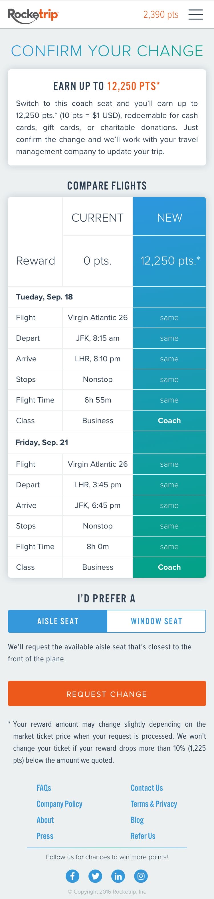 The first round of tests not only revealed a winning direction, it also raised two new issues that hadn’t occurred to us: 1) it wasn’t enough to simply offer to switch someone from Business to Coach—without the ability to select their preference for seats, they wouldn’t proceed. 2) Some of our language around rewards was causing confusion and lowering user confidence.